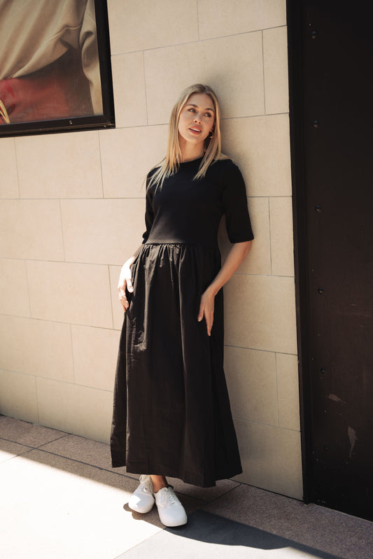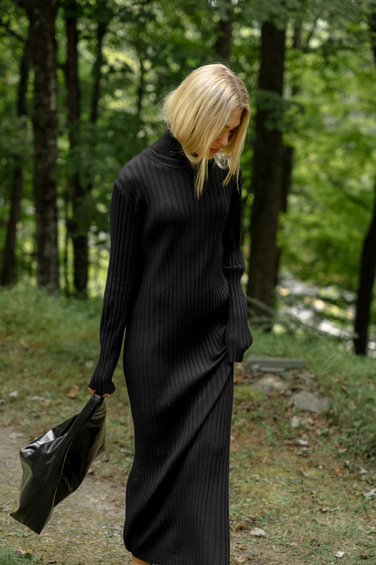 Basic Soft Rib Turtleneck Maxi Dress in Black
