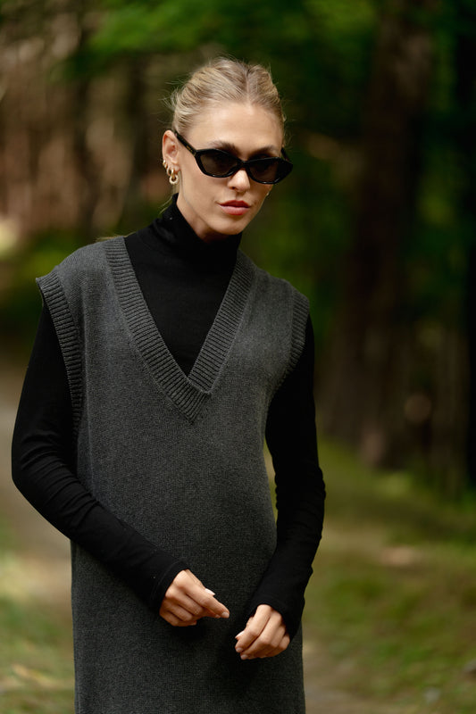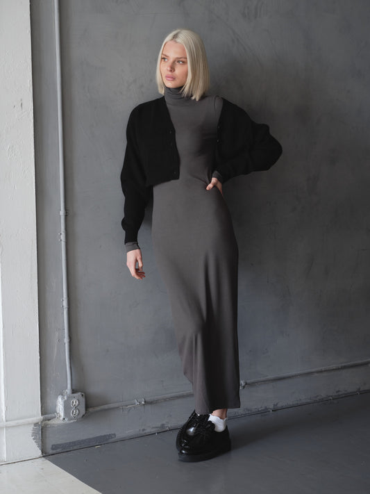 Basic Soft Rib Turtleneck Maxi Dress in Charcoal